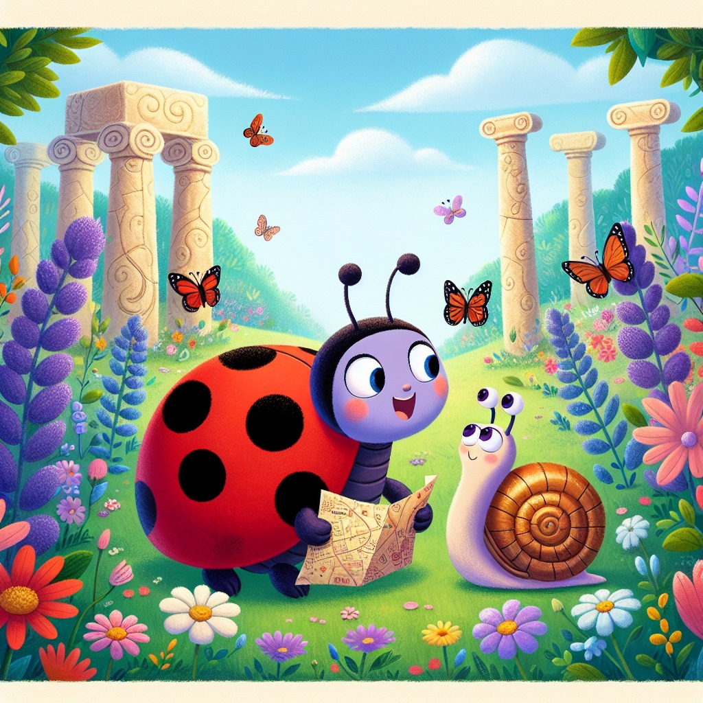 In the vibrant kingdom of Bloomsong, where flowers danced in the gentle breeze and butterflies painted the sky, lived a brave little ladybug named Lila. One sunny morning, while exploring an ancient ruin covered in colorful blossoms, Lila stumbled upon something extraordinary. "What’s this?" she exclaimed, her tiny heart racing with excitement. It was a map, old and crinkled, with a shimmering path leading to the legendary Garden of Wonders. "Lila! What did you find?" called her best friend, Marvin the snail, who was slowly inching his way over to her. Lila held up the map, her eyes sparkling. "Look, Marvin! It shows the way to the Garden of Wonders!" Marvin's eyes widened. "The place where the flowers bloom brighter than the sun and butterflies dance like fairies? We have to go!" Lila nodded eagerly. "Yes! But we must be careful. The path is filled with mysteries and adventures!" With a determined heart, Lila tucked the map under her wing, and together they set off on their grand adventure. The sun shone brightly as they entered the enchanted forest, where the trees whispered secrets and the air was filled with the sweet scent of blooming flowers. "Do you think we’ll meet any magical creatures?" Marvin asked, his voice filled with wonder. "I hope so!" Lila replied, her wings fluttering with excitement. "Let’s keep our eyes open for surprises!" As they ventured deeper into the forest, the colors around them grew more vibrant, and the sounds of nature filled their hearts with joy. Little did they know, their journey was just beginning, and the Garden of Wonders held more than just beautiful flowers—it held the key to a treasure beyond their wildest dreams.