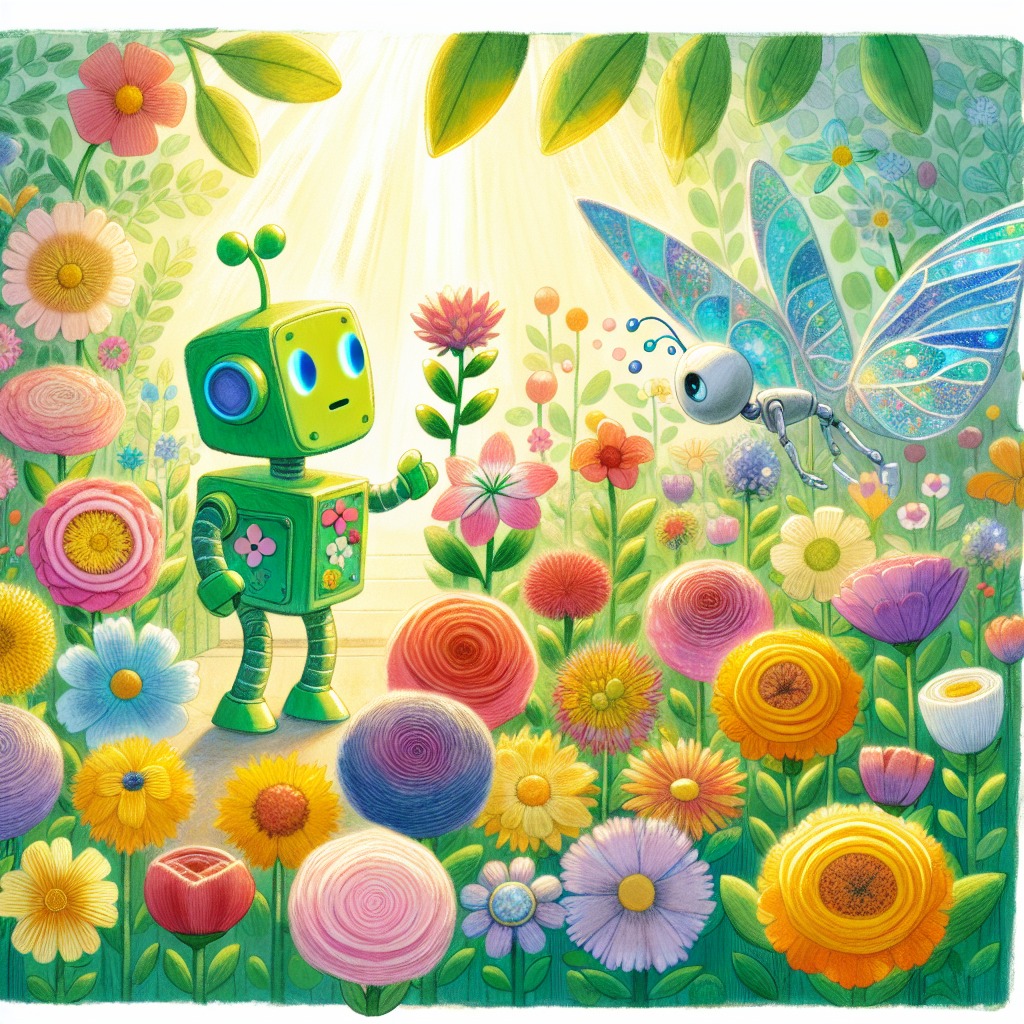 In a vibrant garden where flowers bloomed in every color imaginable, there lived a young robot named Sprout-Bot. Sprout-Bot was not just any robot; he was designed to help flowers grow and thrive. With his shiny green body adorned with flower patterns and bright blue eyes, he loved to explore the garden and learn about the different plants. One sunny morning, as Sprout-Bot was watering the daisies, he noticed something troubling. The flowers were wilting! The once-bright petals drooped sadly, and the garden that was once alive with color now looked dull and lifeless. “Oh no! What happened to my beautiful garden?” Sprout-Bot exclaimed, his circuits buzzing with worry. He looked around, hoping to find a solution. Just then, a gentle flutter caught his eye. It was Flora, the wise butterfly who often visited the garden. “Hello, Sprout-Bot! Why do you look so glum?” Flora asked, landing gracefully on a nearby sunflower. “The flowers are wilting, Flora! I need to help them, but I don’t know how!” Sprout-Bot replied, his voice filled with concern. Flora thought for a moment, her colorful wings shimmering in the sunlight. “Perhaps we can invent something together! A magical gadget that can bring the flowers back to life!” she suggested, her eyes sparkling with excitement. Sprout-Bot’s eyes widened with joy. “That’s a brilliant idea! Let’s get started!” And so, with curiosity and creativity guiding them, Sprout-Bot and Flora began their adventure to save the garden. They gathered materials from all around—shiny metal scraps, colorful petals, and even a few twinkling fireflies to light their way. Together, they would learn the power of friendship and the magic of invention.