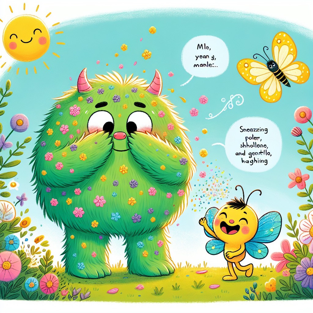 In a garden bursting with colors, where flowers danced in the gentle breeze, lived a monster named Grumble Bump. Unlike other monsters, Grumble Bump didn’t breathe fire; instead, he sneezed pollen! This made him very different, and sometimes, the other creatures in the garden misunderstood him. One sunny morning, Grumble Bump woke up with a tickle in his nose. "Achoo!" he sneezed, sending a cloud of colorful pollen into the air. The flowers giggled, and the butterflies fluttered away, thinking he was scary. Grumble Bump sighed. "I just want to find my friend, Sunny Bloom! She’s the only one who can help me control my sneezes!" Determined, Grumble Bump set off on his quest. As he walked through the garden, he spotted Twirl, a cheerful butterfly flitting about. "Hello there!" Twirl called out, her wings sparkling in the sunlight. "Why do you look so sad?" "I’m trying to find my friend, Sunny Bloom," Grumble Bump replied, his voice soft. "But everyone runs away when I sneeze!" Twirl giggled, "Oh, don’t worry! I think your sneezes are funny! Let’s find Sunny Bloom together!" Grumble Bump felt a warm glow in his heart. Maybe he wasn’t so alone after all. With Twirl by his side, they began their adventure, ready to face whatever silly surprises the garden had in store for them.