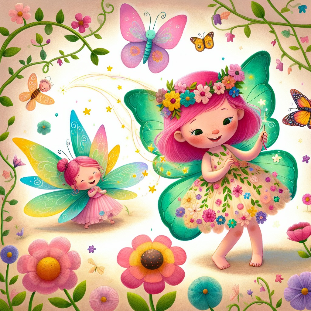 Determined to try again, Petal took a deep breath and focused on the next flower patch. "This time, I’ll get it right!" she declared. She waved her wand with all her might, chanting the spell Miss Blossom had taught them. Suddenly, a bright light surrounded the flowers, and they began to shimmer. But instead of blooming, the flowers grew larger and larger until they burst open, revealing enormous, colorful butterflies! "Wow!" Petal exclaimed, her eyes wide with wonder. The butterflies flapped their wings, creating a gentle breeze that sent petals flying everywhere. "Hello, little pixie!" said one butterfly with sparkling yellow wings. "I’m Flora! Thank you for setting us free!" Petal was amazed. "I didn’t mean to set you free! I just wanted to help the flowers bloom!" she said, feeling a bit embarrassed. Buzzy flew around the butterflies, giggling. "Looks like you’ve created a butterfly party instead!" he teased. Flora laughed, her wings shimmering in the sunlight. "It’s a wonderful mistake! We love to dance and play!" As the butterflies twirled around Petal, she felt a warm glow in her heart. "Maybe this isn’t so bad after all," she thought. But then she remembered the upcoming Blossom Festival. "Oh no! We need to get the garden ready!" she exclaimed. "Can you help me?" The butterflies nodded eagerly. "Of course! Let’s make this garden the most beautiful place for the festival!" Together, they began to work, spreading joy and laughter as they fluttered from flower to flower, creating a magical atmosphere.
