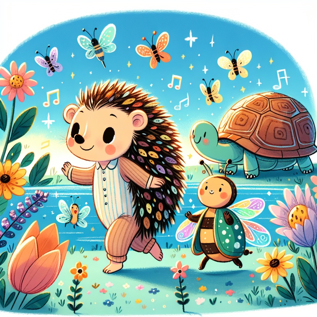 In a magical kingdom where flowers sang sweet melodies, there lived a little hedgehog named Pippin. Every morning, Pippin would wake up to the sound of the flowers humming their favorite tunes. He loved to dance along with them, tapping his tiny paws on the soft grass. One sunny day, Pippin noticed something strange. The flowers were not swaying as they usually did. Instead, they stood still, their bright colors dimming. "What’s wrong with you, my flower friends?" Pippin asked, tilting his head in confusion. Just then, Bella, a shy little beetle with dazzling wings, fluttered down beside him. "I heard the wind is grumpy today, Pippin. It won’t let the flowers dance!" she said, her voice trembling. Pippin frowned. "But we have to do something! The Bloom Festival is tomorrow!" He knew that the festival was the most important day of the year, where everyone celebrated the beauty of the flowers. "Maybe Tully can help us!" Bella suggested, her wings sparkling in the sunlight. Pippin nodded eagerly. "Let’s go find him!" Together, they set off to find their wise friend, Tully the tortoise, who lived by the sparkling river. As they walked, Pippin tapped his paws on the ground, trying to think of a way to cheer up the wind. "What if we could make the wind laugh?" he pondered aloud. Bella’s eyes lit up. "That’s a great idea! But how do we do that?" Pippin smiled, feeling excited. "Let’s ask Tully! He always knows what to do!"