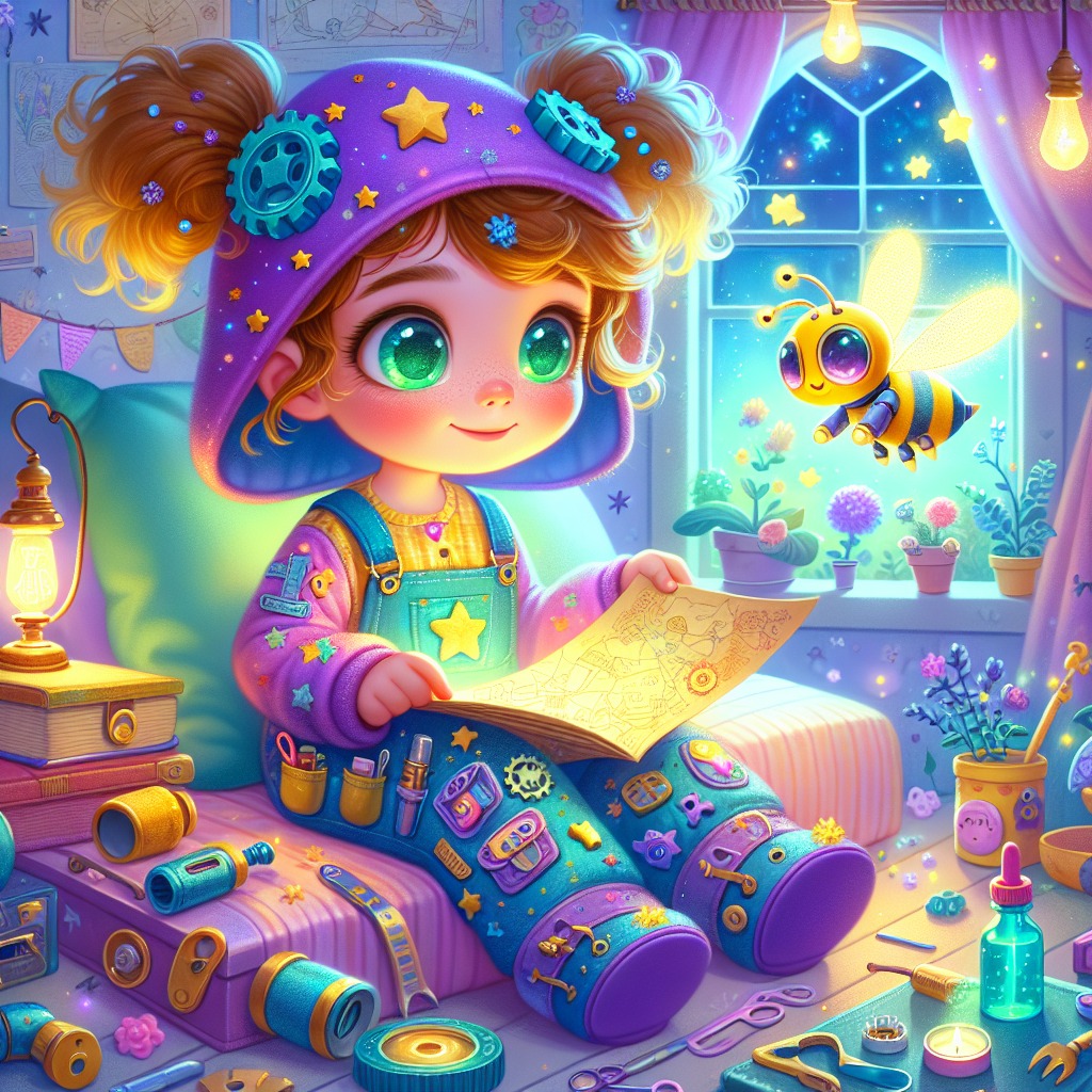 One sunny morning, Tink was tinkering in her workshop, surrounded by colorful gadgets and tools. Her special hat sat on her head, glowing softly as she thought about her next invention. Suddenly, she noticed a glimmering light coming from under her workbench. Curious, Tink crawled under and found an old, dusty map. It was unlike anything she had ever seen! The map showed a path leading to the Land of Whimsy, a place filled with dreams and laughter. "Wow! This looks amazing!" Tink exclaimed, her eyes sparkling with excitement. "I have to go on this adventure!" She quickly gathered her tools and called for her best friend, Buzzy the robot bee. "Buzzy! Come here! Look what I found!" Tink shouted. Buzzy buzzed in, his wings whirring with excitement. "What is it, Tink?" he asked, hovering in the air. "It's a map to the Land of Whimsy! We have to go and explore!" Tink said, her heart racing with anticipation. Buzzy buzzed happily, "Let’s go! I can’t wait to see all the wonders!" With the map in hand and her special hat on her head, Tink and Buzzy set off on their adventure. They followed the winding path through the Enchanted Forest, where trees whispered secrets and flowers danced in the breeze. Tink felt a thrill of curiosity as they ventured deeper into the unknown. As they walked, Tink imagined all the incredible things they might discover. "What do you think we’ll find in Whimsy, Buzzy?" she asked. "Maybe we’ll meet talking animals or see candy mountains!" Buzzy replied, buzzing excitedly. Tink giggled, her imagination running wild. Little did they know, their adventure would be filled with challenges and surprises that would test their creativity and bravery.