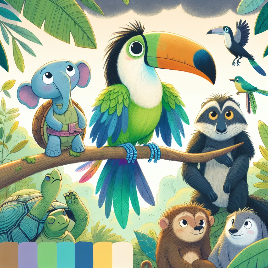 In the heart of a lush, vibrant jungle, Tilly the toucan perched high on a branch, her colorful feathers shimmering in the sunlight. She gazed at the mysterious Whispering Woods, where it was said that every tree told a story. "I wish I could explore those woods!" Tilly exclaimed to her friends, who were gathered around her. "What if we find a tree that tells us about brave explorers?" Her friends, Toby the wise tortoise, Milo the playful monkey, and Bella the shy badger, listened intently. "That sounds amazing, Tilly!" cheered Milo, swinging from a nearby vine. "But what if we get lost?" Bella whispered, her eyes wide with worry. Tilly flapped her wings confidently. "We won't get lost! We can stick together and help each other!" Just then, dark clouds rolled in, and a sudden storm swept through the jungle. The wind howled, and rain poured down. When the storm passed, Tilly noticed her feathered friends were missing! "Oh no! We have to find them!" she cried. "But how?" asked Bella, trembling. Tilly took a deep breath. "We will go to the Whispering Woods! I know we can find them there!" With her heart racing, Tilly rallied her friends. "Let’s be brave and work together!" Toby nodded slowly, his wise eyes sparkling. "I may be slow, but I can help us stay on the right path." Milo jumped excitedly. "I can climb the trees and look for them!" Bella took a deep breath, feeling stronger with her friends by her side. "I’ll be brave too! Let’s go!" And so, Tilly, Toby, Milo, and Bella set off on their adventurous quest, ready to explore the unknown and discover the magic of friendship in the Whispering Woods.