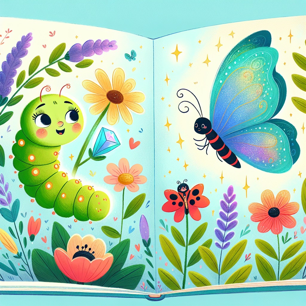 In a magical garden filled with flowers that hummed sweet melodies, lived a curious little caterpillar named Cora. One sunny morning, as she crawled through the vibrant petals of daisies, she noticed something sparkling beneath the soft earth. "What could that be?" Cora wondered, her eyes wide with excitement. She wriggled her way closer and uncovered a shimmering crystal, glowing with colors that danced like the morning sun. "Wow! This is beautiful!" she exclaimed. As Cora held the crystal in her tiny hands, she felt a warm energy flowing through her. Suddenly, the flowers around her began to sway and change shape, blooming into magnificent forms she had never seen before. "This must be magic!" she gasped. Just then, Bella, a graceful butterfly, fluttered down beside her. "What have you found, Cora?" she asked, her wings sparkling in the light. "Look! A magical crystal!" Cora replied, her voice filled with wonder. Bella's eyes widened. "That crystal holds great power. You must use it wisely!" Cora nodded, feeling a sense of responsibility wash over her. She knew she had to protect her garden and its beauty. But how? As they pondered the mystery of the crystal, Oliver, a cheerful ladybug, joined them. "What’s happening?" he asked, landing on a nearby leaf. Cora shared her discovery, and together they decided to explore the garden further, hoping to uncover the secrets of the crystal and its magic. Little did they know, their adventure was just beginning, and the fate of their beloved garden rested in their tiny hands.