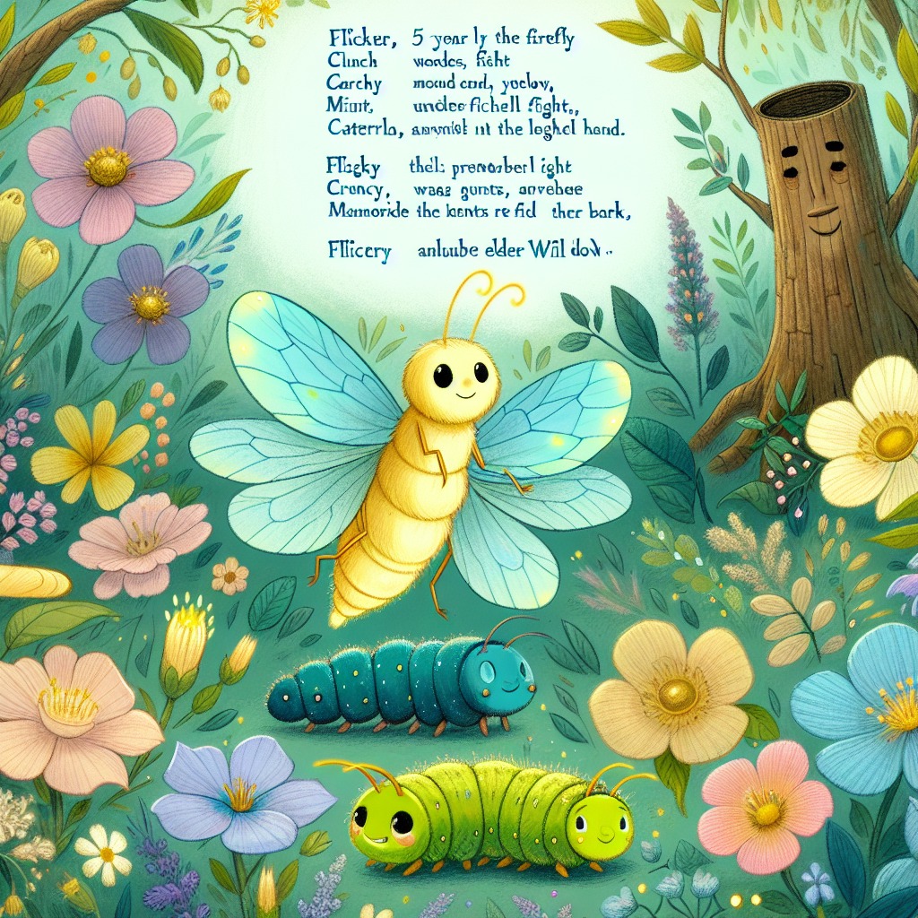 In a magical forest where flowers bloomed in every color of the rainbow, lived a little firefly named Flicker. Flicker was shy and often hid among the petals of the flowers, afraid to show his bright light. One sunny morning, as he fluttered around, he noticed that the flowers were starting to droop. 'Oh no! What's happening to my friends?' Flicker whispered to himself, his tiny heart racing. Determined to help, Flicker took a deep breath and decided to shine his light on the wilting flowers. As he glowed, something amazing happened! The flowers perked up, their colors becoming vibrant once more. 'Wow! My light can help them grow!' Flicker exclaimed, feeling a spark of excitement. Just then, a cheerful voice called out, 'Hey there, little firefly! You have a wonderful light!' It was Crunchy, a brave caterpillar who had been watching Flicker. 'I saw what you did! We need to help the flowers and the butterflies too! They’ve all disappeared!' Flicker nodded, feeling a sense of friendship growing between them. 'But how can we do it?' he asked. 'Let’s find Elder Willow, the wise tree spirit! She knows everything about the forest!' Crunchy suggested. Flicker felt a rush of courage. 'Yes! Let’s go!' Together, they set off on an adventure, ready to discover how they could save their garden and bring back the butterflies. Flicker’s light flickered with hope as they ventured deeper into the forest, excited for what lay ahead.