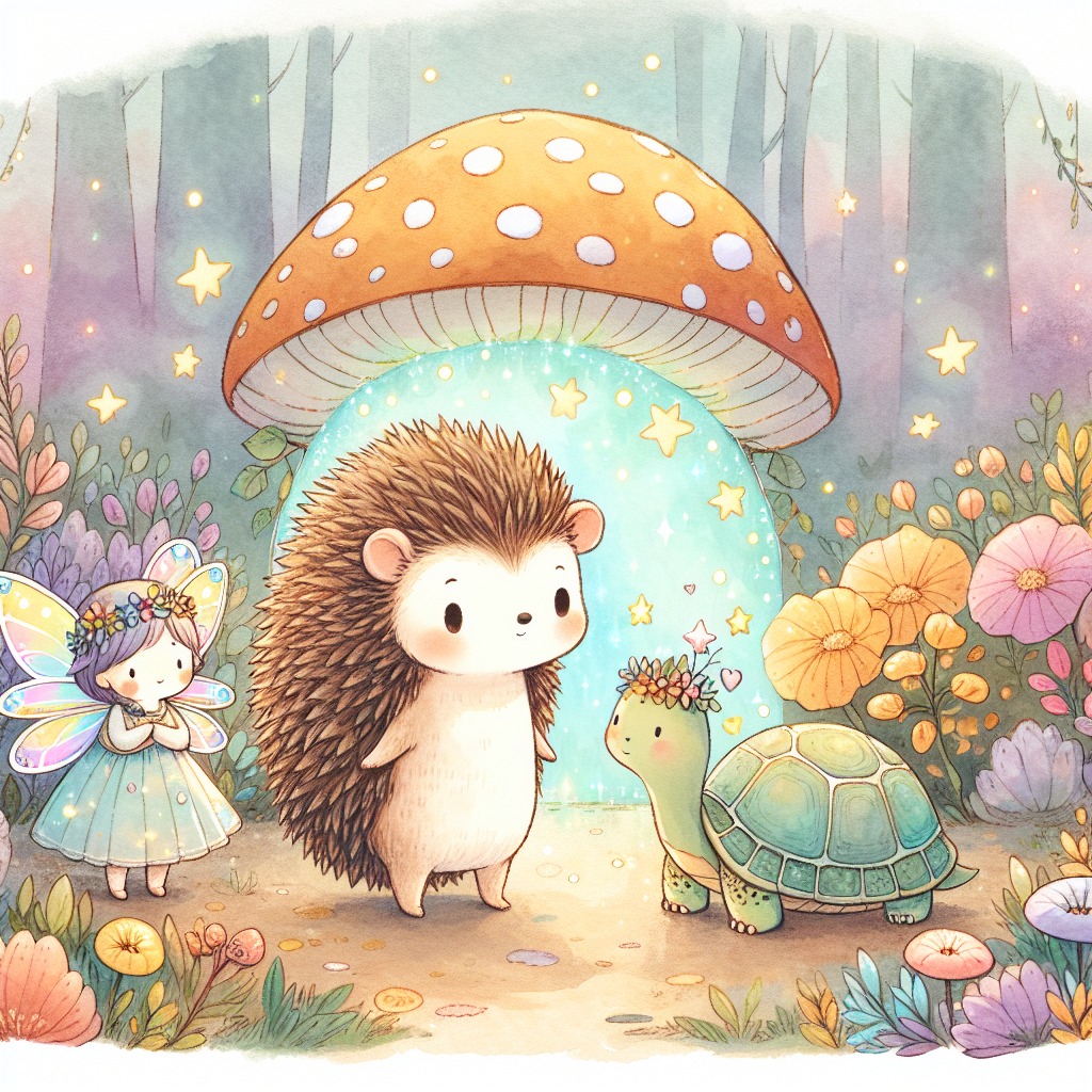 In the heart of the Whimsy Woods, where the trees danced in the gentle breeze and the flowers sang sweet melodies, lived a brave little hedgehog named Quill. One sunny afternoon, while exploring his favorite spot under a giant mushroom, Quill noticed something unusual. A shimmering light flickered beneath the mushroom, catching his curious eyes. "What could that be?" he wondered aloud, his little heart racing with excitement. With a deep breath, Quill approached the glowing portal. It sparkled like a thousand stars, and he could feel a warm breeze inviting him closer. "I must see where this leads!" he exclaimed, his adventurous spirit taking over. Just as he was about to step through, he heard a giggle behind him. "Are you going to jump in?" asked a tiny voice. Quill turned to see a pixie with shimmering wings flitting around him. "I’m Twinkle! I love adventures!" she chirped, her eyes sparkling with mischief. "I’m Quill! I found this portal!" he replied, pointing to the glowing entrance. Twinkle clapped her hands in delight. "Let’s go together! I’ve always wanted to see what’s on the other side!" With a nod of agreement, Quill and Twinkle held hands and jumped into the portal together. In an instant, they were whisked away, swirling through a tunnel of colors and lights. When they landed, they found themselves in a magical land where dreams came to life. But something was wrong. The colors were fading, and the once vibrant landscape looked dull and gray. "Oh no! Where are all the colors?" Quill gasped, looking around in shock. Twinkle fluttered her wings nervously. "We need to find out what happened!" Just then, a wise old turtle named Shelly appeared, slowly making his way towards them. "Welcome, brave explorers! I see you’ve found the portal. But beware, the joy of this land is fading, and it’s up to you to restore it!" Quill felt a surge of determination. "We will help!" he declared. And so, their adventure began, filled with mystery, magic, and the promise of exciting discoveries.