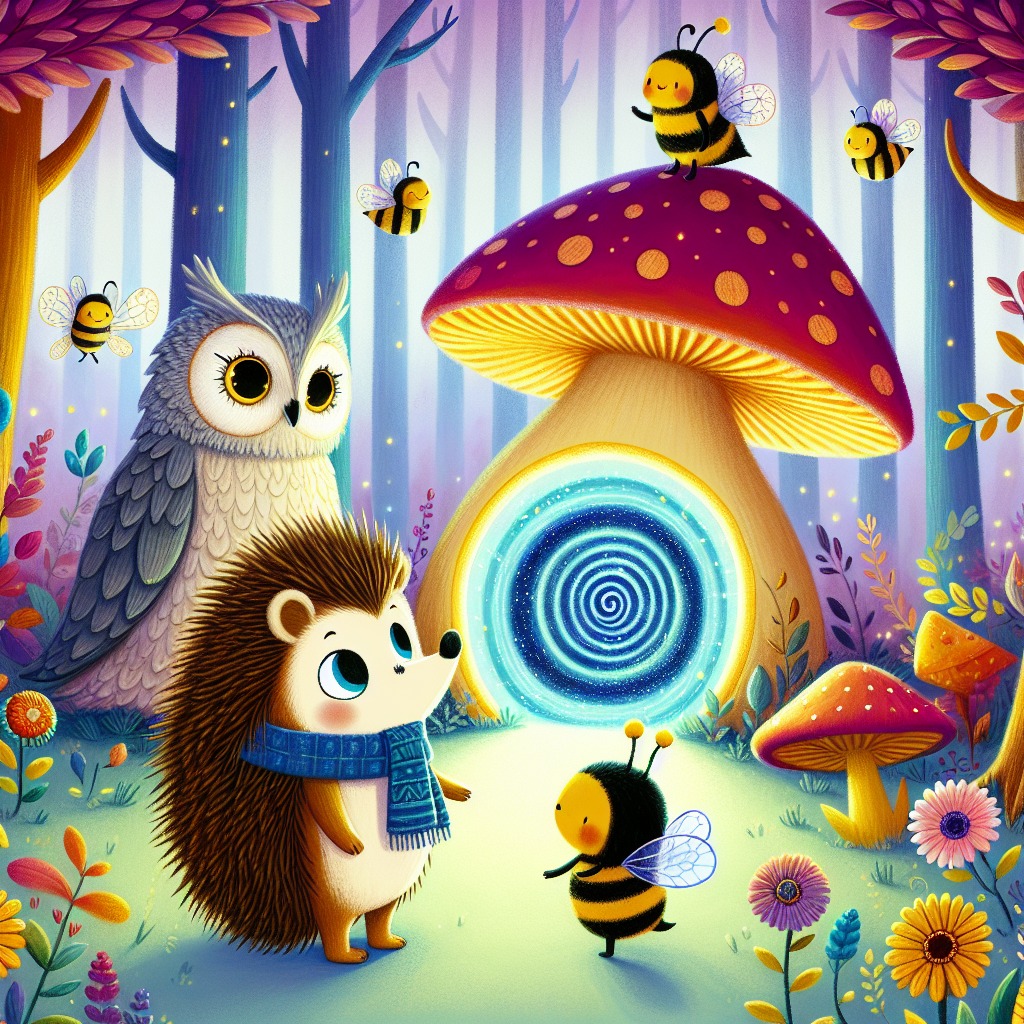 In a quiet village, where the sun shone brightly and the flowers bloomed in every color, lived a brave little hedgehog named Pippin. One sunny afternoon, while exploring the woods near his home, Pippin stumbled upon a giant mushroom. It was unlike any mushroom he had ever seen, shimmering with colors that danced in the sunlight. Curious, Pippin approached it and noticed a soft glow coming from beneath its cap. "What could this be?" Pippin wondered aloud, his tiny heart racing with excitement. He gently nudged the mushroom, and to his surprise, a swirling portal appeared! It sparkled like stars in the night sky, inviting him to step through. "Should I go in?" Pippin asked himself, glancing back at his cozy village. But the thrill of adventure was too strong to resist. With a deep breath, he took a step forward and jumped into the portal. Suddenly, Pippin found himself in an enchanted forest filled with vibrant colors and magical sounds. The trees whispered secrets, and flowers danced in the gentle breeze. "Wow! This place is amazing!" he exclaimed, his eyes wide with wonder. As he wandered deeper into the forest, Pippin met a wise old owl named Luna perched on a branch. "Welcome, brave hedgehog! You have entered a magical realm," she hooted softly. "But beware, for the colors of our world are fading, and only by solving the riddle of the Whispering Wind can you help us restore them." Pippin felt a spark of determination. "I will help!" he declared. "What do I need to do?" Luna fluffed her feathers and said, "First, gather your courage and imagination. You will need them on this quest. Let’s find the other forest creatures and unite them to solve the riddle together!"